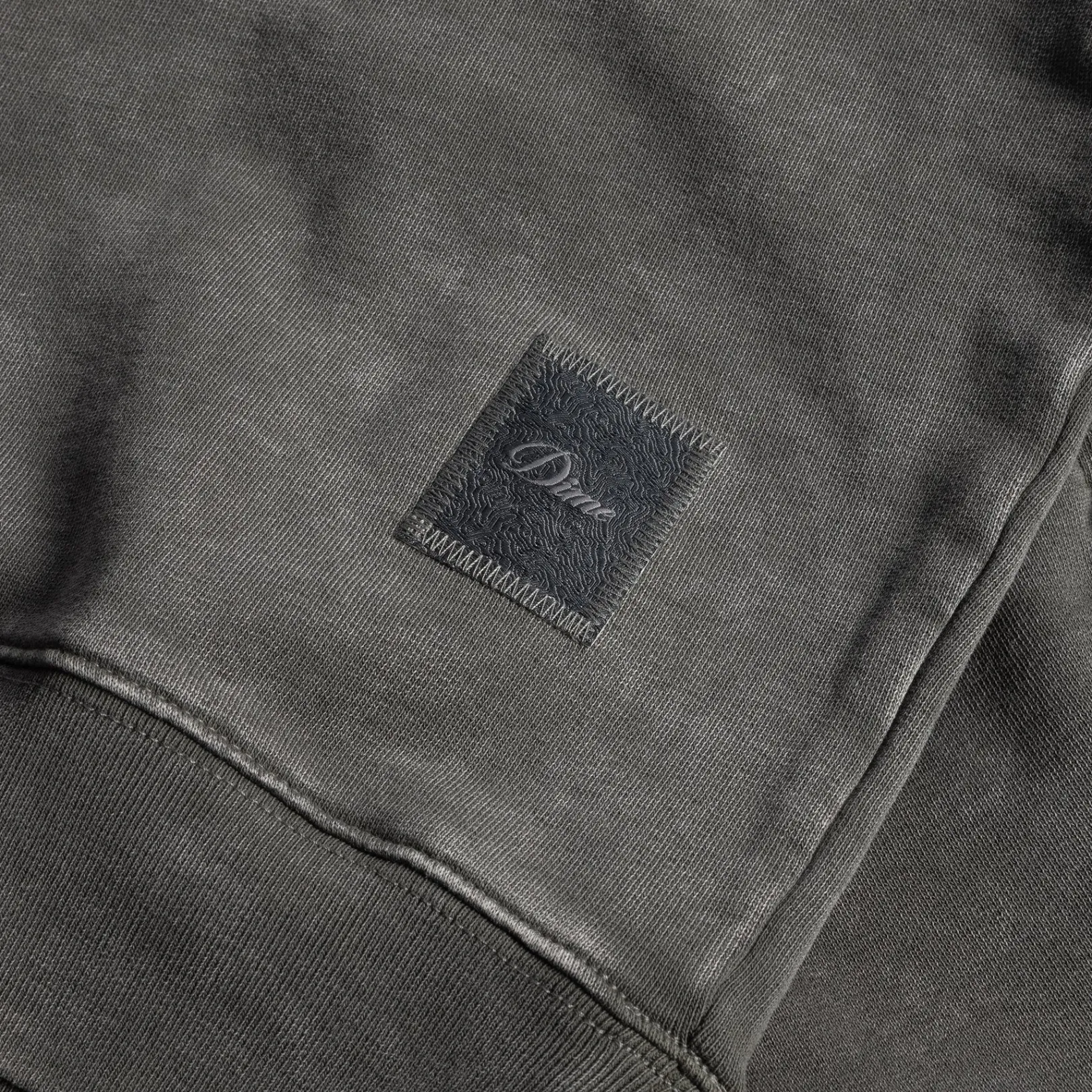 Dime woven label with zigzag stitching at bottom left hand corner